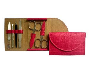 Růžová manikúrní sada v koženém pouzdře pro dokonalou úpravu nehtů.