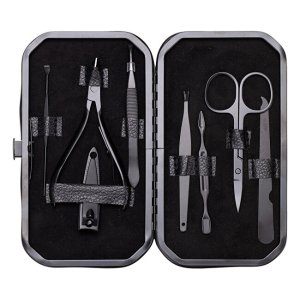 Manikúrní sada balena v praktickém koženkovém pouzdře s kovovou kostrou.