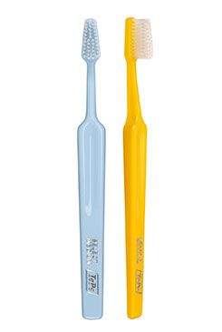 TePe Select Compact soft dětský zubní kartáček má specifický tvar a jemná vlákna.