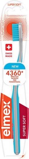 Zubní kartáček elmex® Super Soft s vysokou hustotou až 4360 vláken o průměru 0,13 mm, která čistí s jemnou péčí zuby i dásně.