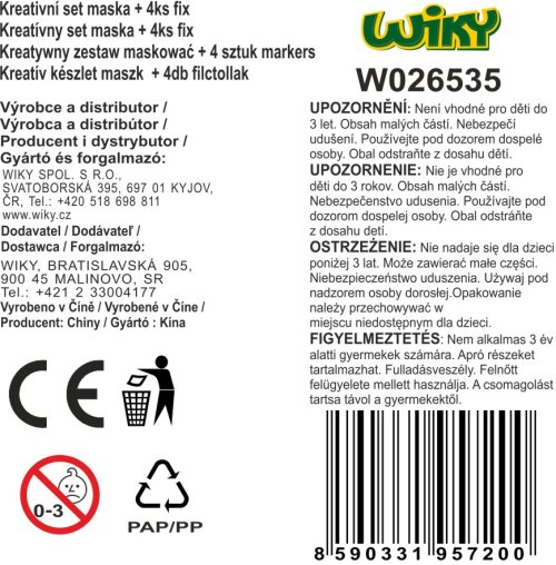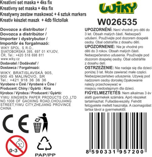 Kreativní set maska o velikosti 22,5x20,5 cm Součástí: maska, 4ks fix. 6 různých motivů