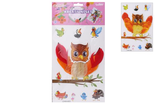 Kreativní set o velikosti 17,5x24,5 cm MIX. Balení obsahuje: lepítka, peří a pomůcky. 4 různé obrázky.