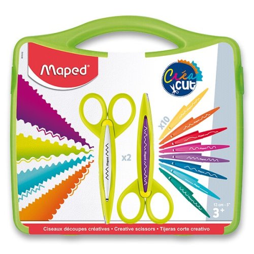 Kreativní nůžky pro děti i dospělé. Snadno vyměnitelné dekorativní čepele ze skelného vlákna. Nemohou stříhat látku, vlasy ani kůži. Stříhají papír 40 až 250 g. Kufřík obsahuje 2 ks nůžek a 10 ks čepelí s různými vzory.