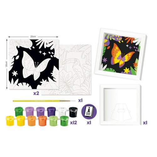 • 2 šablony (20 x 20 cm), * 12 lahviček s akrylovými barvami, * štětec, * rámeček, Vhodné pro děti od 7 let.