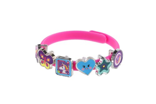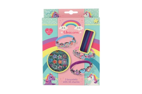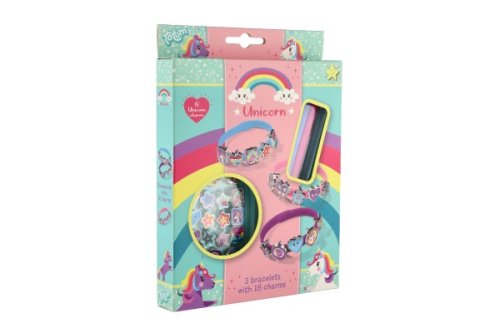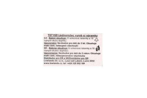 Vyrob si náramek s doplňky s motivem Jednorožce. Vše potřebné k výrobě najdeš uvnitř balení. Balení obsahuje: tři plastové náramky barvy růžové, modré,fialové a 18 různých druhů doplňků s motivem Jednorožce. Rozměr krabičky: 15 x 20,5 x 2,5 cm Vhodné od 3 let