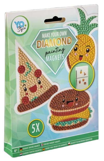 Kreativní sada na výrobu diamantových magnetů, které ozdobí lednici nebo každý povrch, kam lze magnety umístit. Sada obsahuje 2850+ diamantů/kamínků, předlohu/magnety k dokončení - 5 kusů, aplikační pero, lepící čtvereček a tácek, 18x13 cm