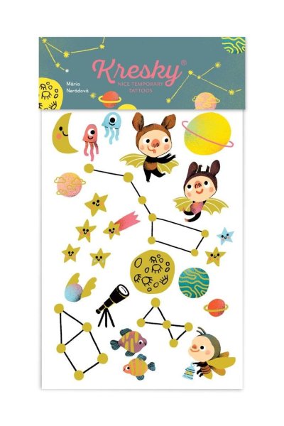 Noční oblohu plnou hvězd si už nemusíte jen představovat. Tetovačky se souhvězdími a nočními tvory vám z vesmíru překreslila Mária Nerádová. Mezi souhvězdími, hvězdičkami a planetami letí také kometa, netopýři a světluška s lucerničkou. Motiv je doplněný zlatou barvou.