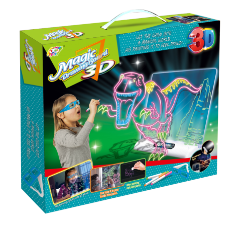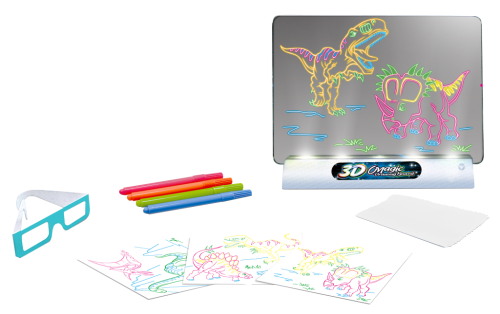Jak to funguje? Stačí namalovat obrázek na přiloženou destičku, vložit ho do speciální čtečky a nasadit 3D brýle – tvé kresby se promění v trojrozměrné mistrovské dílo!