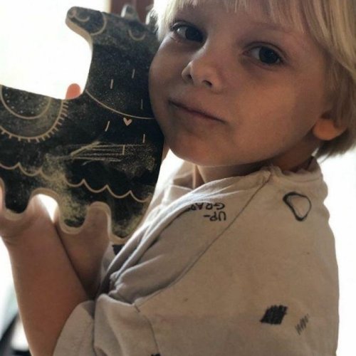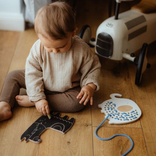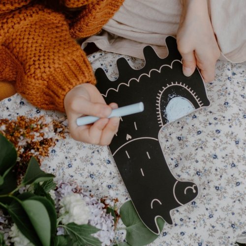 Dřevěná tabulka se 4 křídami rozvíjí grafomotorické dovednosti, podporuje kreativitu a fantazii.