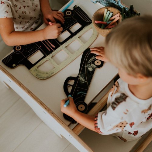 Dřevěná tabulka se 4 křídami rozvíjí grafomotorické dovednosti, podporuje kreativitu a fantazii.