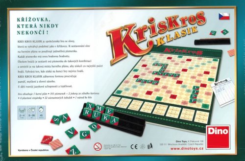 Hra Kris Kros klasik. Balení obsahuje 1 herní plán, 101 žetonů s písmenky, 4 plastové stojánky, 32 záznamových tabulek, 1 textilní sáček a 1 pravidla. Hra je určena pro 2 - 4 hráče. Vhodné od 9 let.