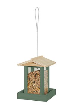 Závěsné krmítko na semena (650g) z certifikovaného borovicového dřeva a kovovým lankem pro větší odolnost. Vrchní plnění přes otvíratelnou stříšku.