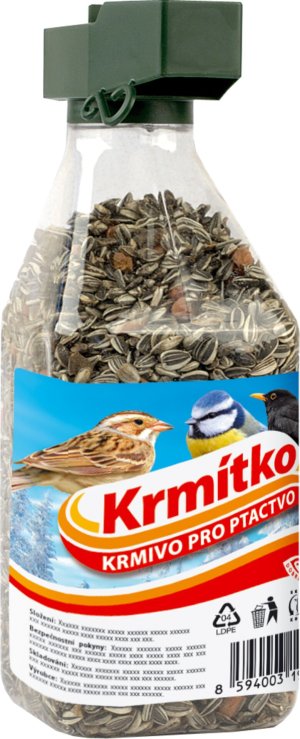 Závěsné plastové krmítko s doplňkovým krmivem pro volně žijící ptactvo. Krmítko se zavěsí hrdlem dolů a plastová nádoba slouží jako zásobník. Obsah lze doplňovat. Náplň je složena z konopí, slunečnice a burských oříšků. Hmotnost náplně: 500 g.