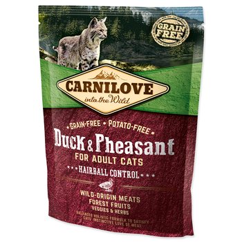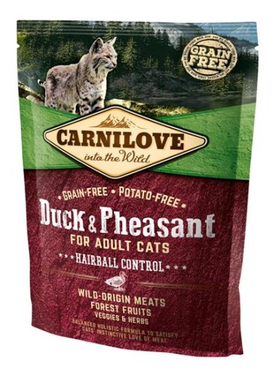 Složení: dehydratované kachní maso (34 %), dehydratované bažantí maso (25 %), žlutý hrách (12 %), kuřecí tuk (chráněno tokoferoly, 6 %), řepné řízky (5 %), čerstvá kachna (5 %), kuřecí játra (3 %), tapiokový škrob (2 %), jablka (2 %), lososový olej (2 %), mrkev (1 %), lněné semínko (1 %), cizrna (1 %), hydrolyzované skořápky korýšů (zdroj glukosaminu, 0,026 %), extrakt z chrupavek (zdroj chondroitinu, 0,016 %), pivovarské kvasnice (zdroj mannan-oligosacharidů, 0,016 %), kořen z čekanky (zdroj frukto-oligosacharidů, 0,012 %), juka schidigera (0,01 %), mořská řasa (0,01 %), psyllium (0,01 %), tymián (0,01 %), rozmarýn (0,01 %), oregano (0,01 %), brusinky (0,0008 %), borůvky (0,0008 %), maliny (0,0008 %). Analytické složky: hrubý protein 40 %, hrubé oleje a tuky 18 %, hrubá vláknina 5 %, hrubý popel 7,8 %, vlhkost 10 %, vápník 1,4 %, fosfor 1,1 %, sodík 0,3 %, hořčík 0,08 %. Nutriční doplňkové látky v 1 kg: vitamín A (E672) 23 000 m.j., vitamín D3 (E671) 940 m.j., vitamín E (3a700) 650 m.j., vitamín C (E300) 300 mg, taurin 2 400 mg, cholinchlorid 2 200 mg, L-karnitin 65 mg, niacin 45 mg, biotin 1,8 mg, zinek (E6) 150 mg, mangan (E5) 55 mg, železo (E1) 48 mg, měď (E4) 11 mg, jód (E2) 3,8 mg, selen (E8) 0,23 mg, DL-methionin (3.1.1.) 14 mg, arginin (3c3.6.1) 12 mg, L-lysin (3.2.3.) 10 mg. Metabolizovatelná energie: 3 800 kcal/kg omega-3: 0,33 %, omega-6: 2,28 %. Krmný návod: