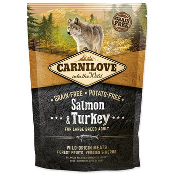 Složení: dehydrovaný losos (25 %), dehydrovaný krocan (20 %), žlutý hrách (20 %), kuřecí tuk (chráněno tokoferoly 10 %), kachní moučka (5 %), hydrolyzovaný losos (5 %), kuřecí játra (3 %), jablka (3 %), lososový olej (2 %), mrkev (1 %), lněné semínko (1 %), cizrna (1 %), hydrolyzované skořápky korýšů (zdroj glukosaminu, 0,05 %), extrakt z chrupavek (zdroj chondroitinu, 0,03 %), pivovarské kvasnice (zdroj mannan-oligosacharidů, 0,015 %), kořen z čekanky (zdroj frukto-oligosacharidů, 0,01 %), juka schidigera (0,01 %), mořská řasa (0,01 %), psyllium (0,01 %), tymián (0,01 %), rozmarýn (0,01 %), oregano (0,01 %), brusinky (0,0008 %), borůvky (0,0008 %), maliny (0,0008 %). Analytické složky: hrubý protein 36 %, obsah tuku 16 %, hrubý popel 7,8 %, hrubá vláknina 3 %, vlhkost 10 %, vápník 1,3 %, fosfor 1 %. Nutriční doplňkové látky na 1 kg: vitamín A (E672) 20 000 m.j., vitamín D3 (E671) 1 500 m.j., vitamín E (α-tokoferol) (3a700) 400 mg, zinek (E6) 85 mg, železo (E1) 70 mg, mangan (E5) 35 mg, jód (E2) 0,65 mg, měď (E4) 15 mg, selen (3b8.10) 0,25 mg. Metabolizovatelná energie: 3 790 kcal/kg. Krmný návod: Podávejte suché nebo navlhčené vodou. Denní dávka se bude lišit podle věku, velikosti, výkonu a prostředí. Doporučené denní dávkování je uvedené v krmné tabulce. Pokud podáváte krmivo Carnilove poprvé, v prvním týdnu podávejte smíchané s původním krmivem a postupně navyšujte podíl Carnilove v celkové denní dávce. Nezapomeňte ke krmení vždy připravit miskou s čerstvou pitnou vodou. Spotřebujte do data uvedeného na obalu. Uchovejte v suchém a chladném místě.