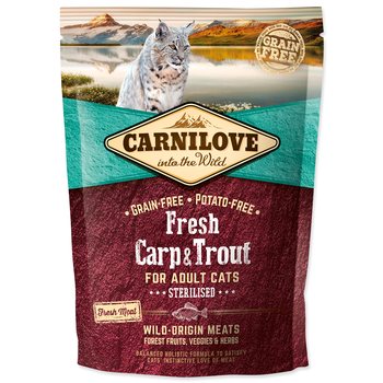 Carnilove Kapr & Pstruh je superprémiové, holistické kvalitní krmivo bez obilí a zemiaků s čerstvým masem pro dospělé kastrované kočky.