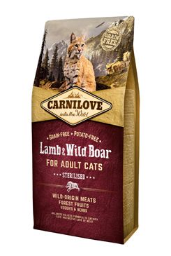 Složení: kančí masová moučka (35 %), jehněčí z volného chovu (24 %), žlutý hrách (19 %), kuřecí tuk (chráněno tokoferoly, 6 %), jablka (4 %), kuřecí játra (3 %), tapiokový škrob (3 %), lososový olej (2 %), mrkev (1 %), lněné semínko (1 %), cizrna (1 %), hydrolyzované skořápky korýšů (zdroj glukosaminu, 0,026 %), extrakt z chrupavek (zdroj chondroitinu, 0,016 %), pivovarské kvasnice (zdroj mannan-oligosacharidů, 0,016 %), kořen z čekanky (zdroj frukto-oligosacharidů, 0,012 %), juka schidigera (0,01 %), mořská řasa (0,01 %), psyllium (0,01 %), tymián (0,01 %), rozmarýn (0,01 %), oregano (0,01 %), brusinky (0,0008 %), borůvky (0,0008 %), maliny (0,0008 %). Analytické složky: hrubý protein 39 %, hrubé oleje a tuky 14 %, hrubá vláknina 4 %, hrubý popel 7,8 %, vlhkost 10 %, vápník 0,8 %, fosfor 0,7 %, sodík 0,9 %, hořčík 0,04 %. Nutriční doplňkové látky v 1 kg: vitamín A (E672) 23 000 m.j., vitamín D3 (E671) 940 m.j., vitamín E (3a700) 650 m.j., vitamín C (E300) 300 mg, taurin 2 400 mg, cholinchlorid 2 200 mg, L-karnitin 65 mg, niacin 45 mg, biotin 1,8 mg, zinek (E6) 150 mg, mangan (E5) 55 mg, železo (E1) 48 mg, měď (E4) 11 mg, jód (E2) 3,8 mg, selen (E8) 0,23 mg, DL-methionin (3.1.1.) 14 mg, arginin (3c3.6.1) 12 mg, L-lysin (3.2.3.) 10 mg. Metabolizovatelná energie: 3 690 kcal/kg omega-3: 0,25 %, omega-6: 2,30 %. Krmný návod:
