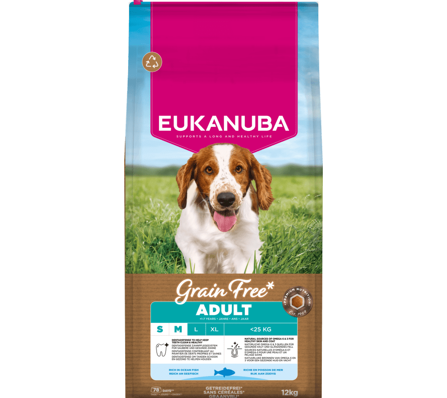 Složení: | Moučka z mořských ryb (21 %, přírodní zdroj omega 3 mastných kyselin), brambory, celý hrášek, batáty (12 %), vepřový tuk, čerstvý losos (4 %), moučka z lososa (4 %), sušená řepná dužina (3,4 %), rybí omáčka, slunečnicový olej, minerální látky (včetně hexametafosforečnanu sodného 0,39 %), fruktooligosacharidy (0,29 %, přírodní prebiotikum). |
