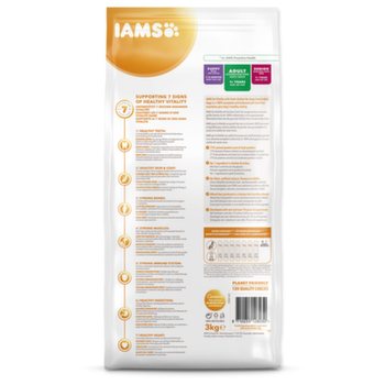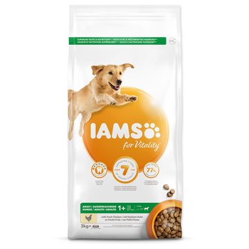 Krmivo IAMS for Vitality pro dospělé psy velkých plemen je 100% kompletní a vyvážené, odborníky sestavené krmivo, které bude vašemu zvířeti chutnat a svědčit. Naše nová a vylepšená receptura pro dospělé psy s čerstvým kuřecím masem je založena na kvalitních živočišných bílkovinách, které byly pečlivě vybrány, aby podporovaly sedm znaků zdravé vitality psa. Aby byl váš pes zdravý, aktivní a plný energie, obsahují naše lahodné receptury až 77 % živočišných bílkovin (z celkového obsahu bílkovin).