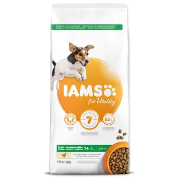 Krmivo IAMS for Vitality pro dospělé psy malých a středních plemen je 100% kompletní a vyvážené odborníky sestavené krmivo, které bude vašemu zvířeti chutnat a svědčit. Naše nová a vylepšená receptura pro dospělé psy s čerstvým kuřecím masem je založena na kvalitních živočišných bílkovinách, které byly pečlivě vybrány, aby podporovaly sedm znaků zdravé vitality psa. Aby byl váš pes zdravý, aktivní a plný energie, obsahují naše lahodné receptury až 82 % živočišných bílkovin (z celkového obsahu bílkovin).