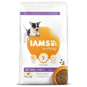 Krmivo IAMS for Vitality pro štěňata malých a středních plemen je 100% kompletní a vyvážené odborníky sestavené krmivo, které bude vašemu štěněti svědčit. Naše nová a vylepšená receptura pro štěňata s čerstvým kuřecím masem je založena na kvalitních živočišných bílkovinách, které byly pečlivě vybrány, aby podporovaly sedm znaků zdravé vitality štěněte. Aby byla štěňata zdravá, aktivní a plná energie, obsahují naše lahodné receptury až 85 % živočišných bílkovin z kuřecího masa (z celkového obsahu bílkovin).