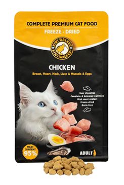 Prémiové kompletní krmivo pro kočky s 95 % masa. Díky šetrné lyofilizaci si zachovává přirozenou chuť, aroma i důležité živiny bez použití umělých konzervantů. Grain-free receptura staví na pečlivě vybraných surovinách, které respektují přirozené potřeby kočky. Krmivo je velmi dobře stravitelné a vhodné i pro citlivější jedince.