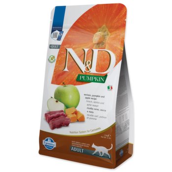 Vyvážené kompletní bezobilné krmivo se zvěřinou pro dospělé kočky. Bezobilná řada N&D Pumpkin kombinuje kvalitní živočišné bílkoviny s dýní pro kvalitní nasycení vašeho zvířecího kamaráda. Granule obsahují 96 % proteinů živočišného původu. Přidaná dýně je bohatá na betakaroteny a přírodní antioxidanty, chrání kardiovaskulární systém a podporuje imunitní systém a správnou motilitu střev. Rybí olej zaručuje optimální poměr omega-3 a omega-6 mastných kyselin pro dobrou kondici kůže a srsti a jejich regenerační schopnost. Hlavní výhody: