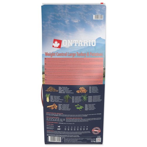 musí splňovat veškeré výživové a nutriční požadavky pro zdravé fungování celého organismu. Proto značka Ontario vyvinula ve spolupráci s veterináři a nutričními specialisty unikátní a výjimečně chutnou recepturu, která poskytuje vyvážené složení pro psy trpícími nadváhou a správný poměr všech živin. Kvalitní strava je jednou z nejdůležitějších podmínek pro zdravý a dlouhý život Vašeho psa. Receptura založená na vysokým podílu kvalitních proteinů z krůtího masa a na bramborách, které jsou po tepelné úpravě nejlepším zdrojem sacharidu. Krmivo má snížený obsah tuku a energetickou hodnotu pro redukci hmotnosti. Je vhodné i pro udržování stávající váhy. S nízkým obsahem obilovin, bez pšenice nebo kukuřice. Jedinou obilovinou je rýže. Vyvážené složení pro zdravé fungování celého organismu. Chondroprotektiva a rybí olej pro zajištění zdravé pohybové soustavy a kloubu. Krmivo obsahuje speciální mix bylinek a koření, zejména anýz, hřebíček a mořské řasy, pro udržení správné ústní hygieny a zdravých zubů.