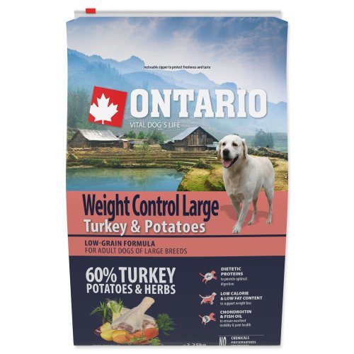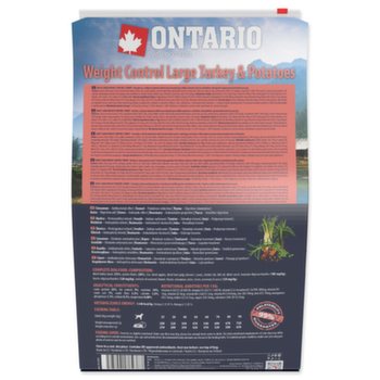 musí splňovat veškeré výživové a nutriční požadavky pro zdravé fungování celého organismu. Proto značka Ontario vyvinula ve spolupráci s veterináři a nutričními specialisty unikátní a výjimečně chutnou recepturu, která poskytuje vyvážené složení pro psy trpícími nadváhou a správný poměr všech živin. Kvalitní strava je jednou z nejdůležitějších podmínek pro zdravý a dlouhý život Vašeho psa. Receptura založená na vysokým podílu kvalitních proteinů z krůtího masa a na bramborách, které jsou po tepelné úpravě nejlepším zdrojem sacharidu. Krmivo má snížený obsah tuku a energetickou hodnotu pro redukci hmotnosti. Je vhodné i pro udržování stávající váhy. S nízkým obsahem obilovin, bez pšenice nebo kukuřice. Jedinou obilovinou je rýže. Vyvážené složení pro zdravé fungování celého organismu. Chondroprotektiva a rybí olej pro zajištění zdravé pohybové soustavy a kloubu. Krmivo obsahuje speciální mix bylinek a koření, zejména anýz, hřebíček a mořské řasy, pro udržení správné ústní hygieny a zdravých zubů.