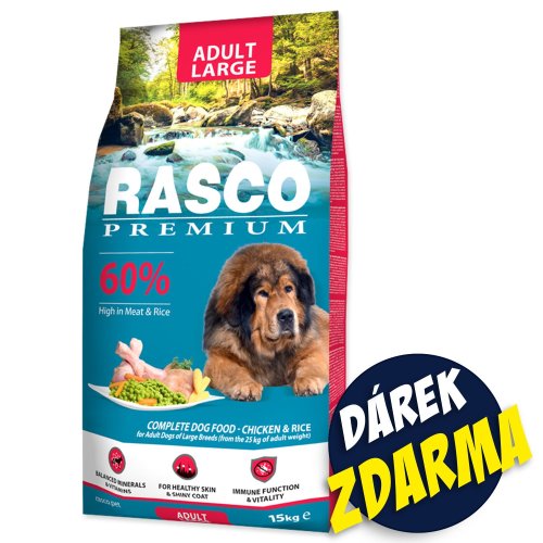 Kompletní krmivo s kuřecím masem a rýží pro dospělé psy velkých a obřích plemen o hmotnosti nad 25 kg. Chutná a lehce stravitelná receptura na bázi kuřecího masa a rýže z pečlivě vybraných surovin pro optimální tělesný stav a spokojený život dospělých psů velkých plemen. vysoký obsah proteinů z kuřecího masa na podporu vitality a optimální kondice glukosamin a chondroitin na podporu zdravých kloubů, vápník pro zdravé zuby a kosti pivovarské kvasnice a lososový olej pro zdravou kůži a lesklou srst vyvážené složení s vitamíny a minerály, vlákninou a prebiotiky pro optimální tělesný stav vašeho psa Složení: kuřecí moučka 27%, kukuřice, rýže 19%, triticale, masová moučka 9%, kuřecí tuk 5%, dužnina cukrové řepy (zdroj vlákniny), pivovarské kvasnice, lososový olej 0,5%, hrášek 0,5%, sušená mrkev 0,2%, extrakt z čekanky, mannanoligosacharidy (MOS), glukosamin 200 mg / kg, chondroitin sulfát 80 mg / kg. Analytické složky: hrubý protein 23 %, hrubá vláknina 2 %, hrubé tuky 12 %, hrubý popel 7 %, vlhkost 9 %, vápník 1,4 %, fosfor 1 %, omega-3 mastné kyseliny 0,19 %, omega-6 mastné kyseliny 1,77 %. Doplňkové látky/1 kg: nutriční doplňkové látky: vitamín A (3a672a) - 14 400 IU, vitamín D_ (3a671) - 1 200 IU, vitamín E (3a700) - 144 mg, železo (II) (monohydrát síranu železnatého - 3b103) - 40 mg, jód (jodičnan vápenatý bezvodý - 3b202) - 1,2 mg, měď (II) (pentahydrát síranu měďnatého - 3b405) - 4 mg, mangan (monohydrát síranu manganatého - 3b503) - 16 mg, zinek (monohydrát síranu zinecnatého - 3b605) - 72 mg, selen (seleničitan sodný - 3b801) - 0,1 mg, taurin (3a370) - 100 mg. Technologické přísady: antioxidanty, konzervační látky. Energetická hodnota: 3 470 kcal/kg.