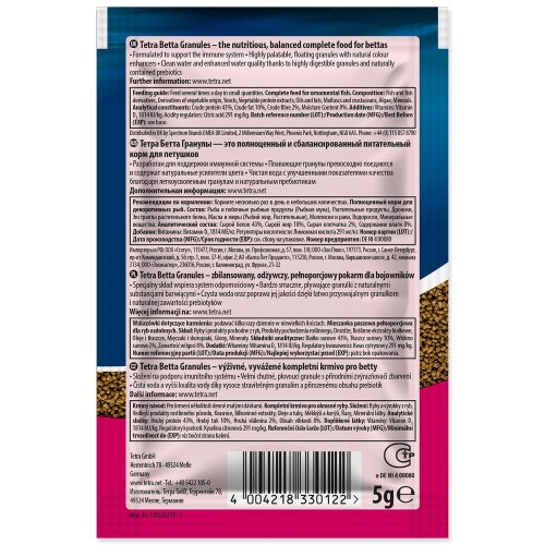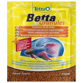 Tetra Betta Granules – nutričně vyvážené krmivo pro bety bojovnice. Vysoce chutné plovoucí granule s látkami podporujícími přirozenou barvu, které zajišťují krásné zbarvení. Obohacené vitamíny a živinami pro posílení imunitního systému. Nekalí vodu. Použití: Krmte takovým množstvím, aby ve vodě nezůstávali zbytky potravy. Složení: Ryby a výrobky z ryb, obiloviny, sušené krmné kvasnice, měkkýši a korýši, vejce a výrobky z vajec, oleje a tuky, cukr, řasa, lecitin. Velikost balení: 5 g