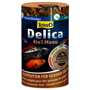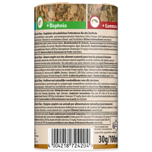 Vysoce hodnotná směs vločkových krmiv-kompletní krmivo, obohaceno lyofilisovanými hovězími játry, nitěnkami a komářími larvami ve čtyřech nádobách.