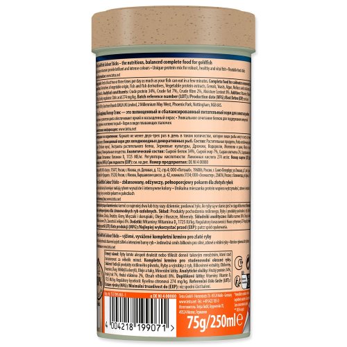 Granulované kompletní krmivo příznivě ovlivňující zbarvení u zlatých a ostatních druhů jezírkových ryb.