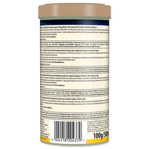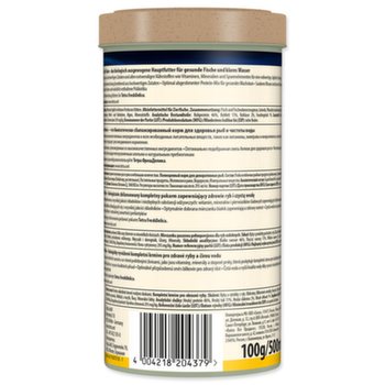 Kompletní vločkové krmivo pro všechny druhy okrasných rybek. Obsahuje 40 pečlivě vybraných, vysoce kvalitních surovin, zahrnujících veškeré významné živiny pro život, vitamíny a stopové prvky. Posiluje obranné mechanismy jejich organismu, kladně ovlivňuje stavbu kostry a napomáhá růstu. Obsahuje stabilní množství vitamínu C.
