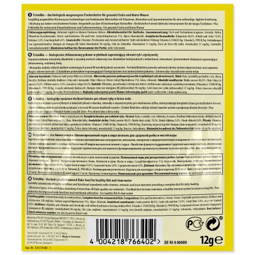 Složení: ryby a vedlejší výrobky z ryb, obiloviny, sušené krmné kvasnice, vedlejší výrobky rostlinného původu, měkkýši a korýši, oleje a tuky, řasy, cukr, lecitin.
