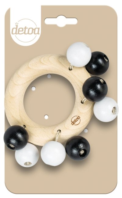 Dřevěné chrastítko kroužek a kuličky v moderní černobílé kombinaci barev. Snadno uchopitelné, rachtající.