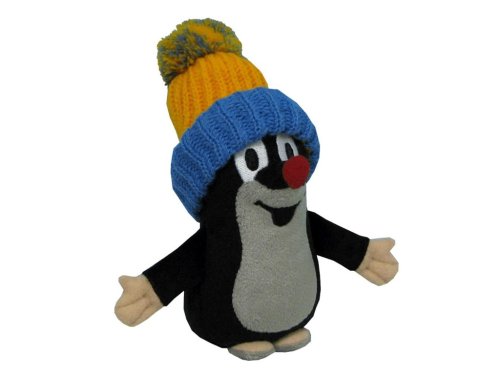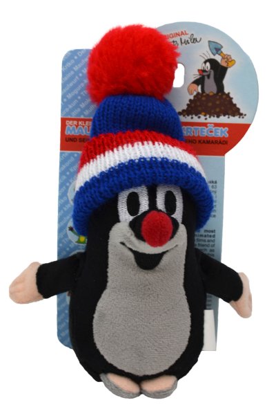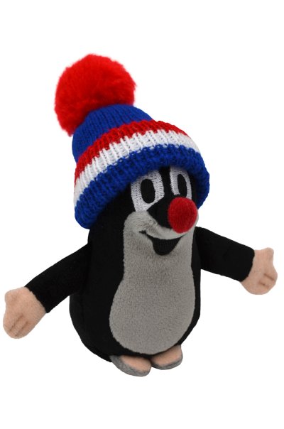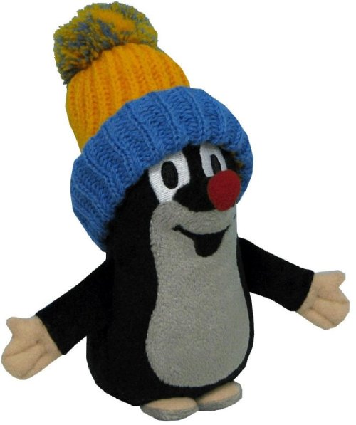 Plyšová postavička Krtka s modro-žlutým kulichem. Velikost 15 cm.