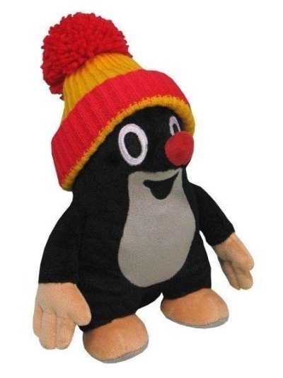 Plyšový Krteček s pletenou sundavací čepicí.