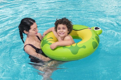 Kruh ve tvaru pandy má rozměry 79×85 cm a je zdoben motivem zelených bambusových listů na bílém podkladu, přičemž dvě nafukovací „ušiska“ dodávají kruhu výrazný a hravý vzhled. Design žáby je naopak veselý a barevný, s kombinací žluté a zelené barvy, s očima a úsměvem na přední straně a malými „pacičkami“ na spodní straně, přičemž jeho rozměry jsou 85×76 cm. Oba modely mají dostatečně velký otvor uprostřed, který umožňuje pohodlné a bezpečné usazení dítěte, a zároveň jsou dostatečně stabilní při plavání.