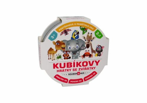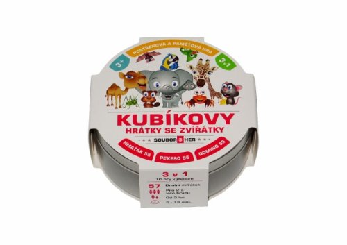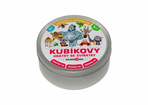 Zábavná karetní postřehová a paměťová hra balená v malé plechové krabičce. To jsou Kubíkovy hrátky se zvířátky, které obsahují tři zábavné karetní hry: Hmaťáka, Domino a Pexeso. Děti si zábavnou formou zlepšují postřeh, paměť a také se mohou přiučit angličtině. Jednoduchá pravidla a stále usměvavá zvířátka. 57 druhů zvířátek, hra pro 2 a více hráčů. Rozměry výrobku 10 x 10 x 4 cm. Vhodné pro děti od 3 let.