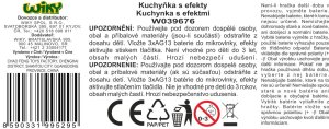Kuchyňka s efekty. Rozměry 10,5x6,5x30 cm. Světelné a zvukové efekty tlačítkem na mikrovlnce. 3xAG13 baterie do mikrovlnky součástí. Obsah - myčka nádobí, mikrovlnka, skříňka, topinkovač, nádobí, jídlo, nápoje.