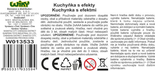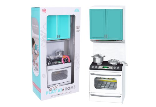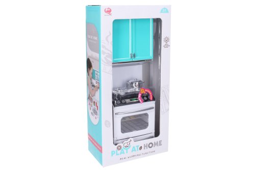 Kuchyňka. Rozměry 10x8x32 cm. Vařič a trouba vydává světelné a zvukové efekty. Efekty se zapínají spínačem na vařiči. 2xAAA baterie součástí.