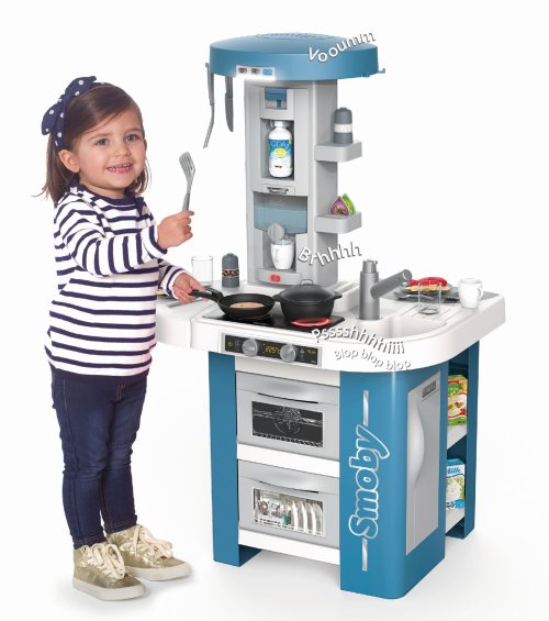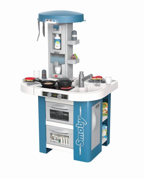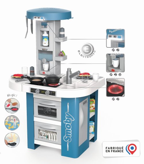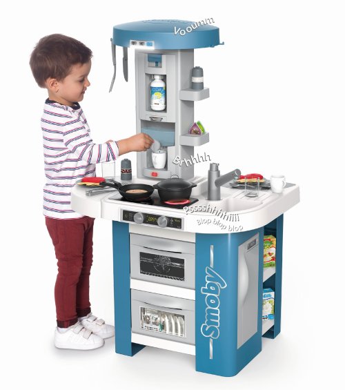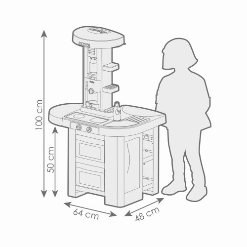 Stabilní kuchyňka Studio Tech Edition je kompaktní, stabilní kuchyňka s mnoha extra elektronickými funkcemi. S velkou herní plochou 360° - lze si hrát ze všech stran. Kuchyňská deska je vybavena elektronickou varnou deskou se dvěma různými zvuky vaření a červeným osvětlením. Kávovar má plnitelnou nádržku na vodu, pomocí které lze přes ventil plnit vodu do šálků. Po stisknutí tlačítka se objeví blikající světlo, které napodobuje zahřívání přístroje, a když tlačítko znovu stisknete, uslyšíte realistický zvuk přístroje na espresso. Digestoř má tři různé úrovně hluku a také světelnou funkci. Kuchyňka má také troubu, myčku, lednici, dřez s kohoutkem, automat na sodu a několik úložných prostor. Obsahuje 35 zábavných doplňků: těstoviny, které ve studené vodě mění barvu, pánvičku na snadné palačinky, kávové kapsle, ryby a steaky, slánku a pepřenku se zvukem „cvaknutí“, pánve, kuchyňské náčiní, nádobí, příbory, hrnky, brýle atd. Rozměry (DxŠxV): 64 x 48 x 100 cm.