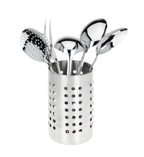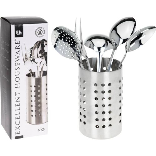 praktická sada kuchyňského vybavení ve stojanu- nejčastěji používané kuchyňské pomůcky při vaření, máte přehledně v jednom stojanu vždy po ruce- materiál kuchyňského náčiní: nerezová ocel- sada 6 ks obsahuje:- vidlička 32 cm- lžíce 33 cm- děrované lžíce 33 cm- naběračka 28,5 cm- pěnovačka 32 cm- držák na náčiní pr. 10,5 x 18 cm- držák lze použít také jako odkapávač