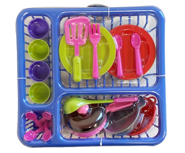 Plastová sada do kuchyně obsahuje odkapávač, hrníčky, talíře, příbory, kuchyňské náčiní.
