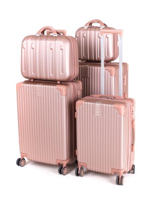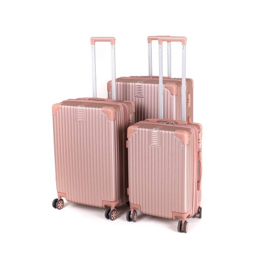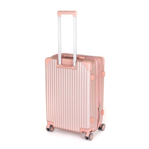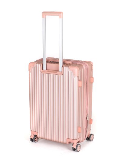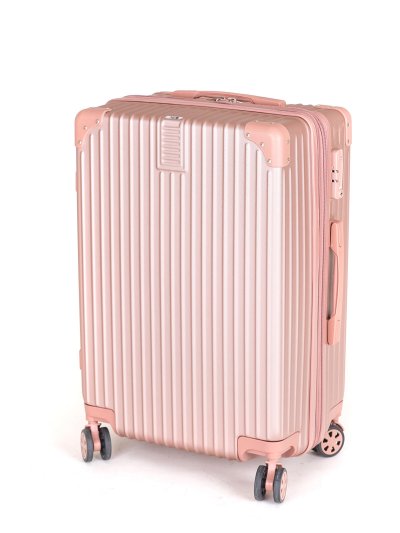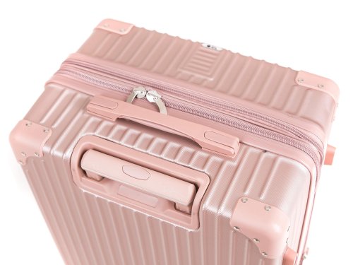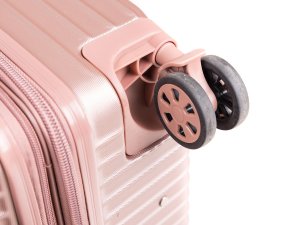 Cestovní skořepinový kufr na kolečkách ABS25, se zpevněnými rohy, velikosti M, ve zlatorůžové barvě, je vyrobený z kvalitního plastu ABS, který je odolný proti nárazu. Je opatřený 4 dvojitými kolečky otočnými o 360 stupňů, díky kterým je manipulace s kufrem velice snadná. Kufr má 3 plastová madla: boční a dvě horní, z nichž je jedno s teleskopickou rukojetí s pojistkou proti zasunutí a možností nastavitelné výšky ve více polohách. Kufr se uzavírá na zip a oba jezdce můžete spojit do kódového zámku TSA, který velmi uvítáte při náhodných kontrolách na letišti. Vnitřní část kufru má látkovou dělící přepážku s kapsou a křížové upínání pro lepší fixaci a uspořádání vašich věcí. Kufr je vybaven expanderem, díky kterému je možné po rozepnutí 1 zipu kufr rozšířit do hloubky o několik cm a objemově tak zvětšit prostor až o pětinu.