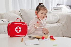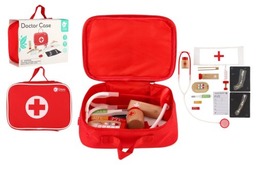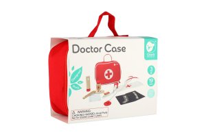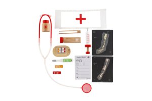 Vše, co potřebuje doktor najedete v tomto setu. Stačí si vzít stetoskop (plastový) a můžete začít léčit. V sadě je spousta dřevěných doplňků, aby hra byla zajímavější a dokážete tak vyléčit každou bolístku. Sada obsahuje 19 ks. Rozměry balení 22 x 17 x 8 cm. Vhodné pro děti od 3 let.