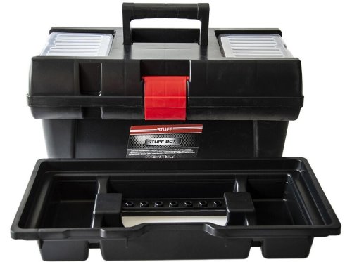 Kufr na nářadí STUFF PROFI je vyrobený z kvalitního plastu, ve vrchní části jsou dva organizéry pro drobné součástky uzavřené víkem, připraven i otvor pro visací zámek."
