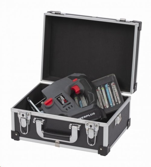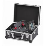 Černo-stříbrný hliníkový kufr KRT640106B značky Kreator má rozměry 320 x 230 x 160 mm. Pevný box obsahuje polstrování bez přihrádek, snadno tak uložíte i větší kusy nářadí.