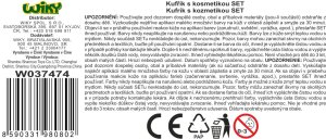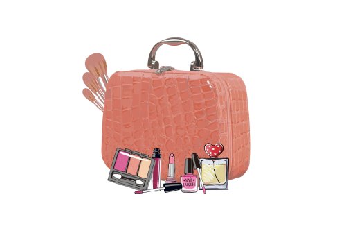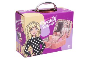 Kufřík s kosmetikou. Velikost 19 cm. Obsahuje zrcátko, umělé nehty, lesk na rty, tvářenku, oční stíny, pilníky na nehty, sadu štětců, balzám na rty, oční linky, třpytivé dekorace.
